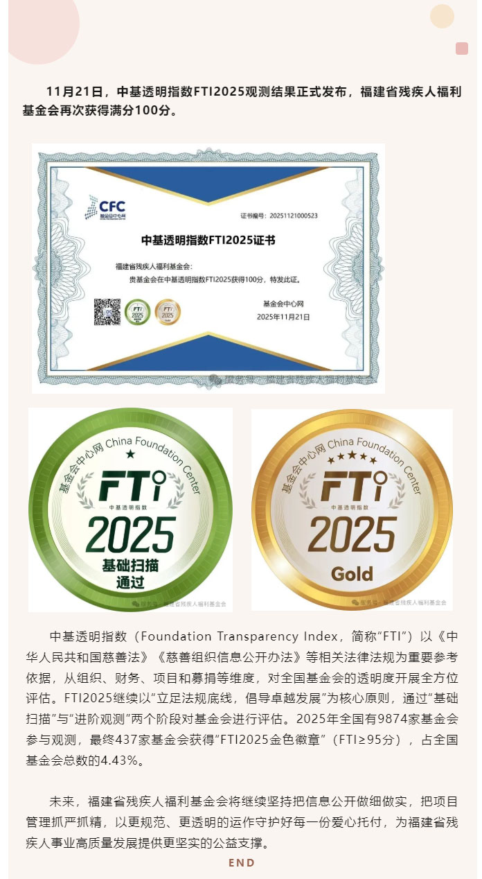 【本会要闻】福建省残疾人福利基金会中基透明指数再获满分